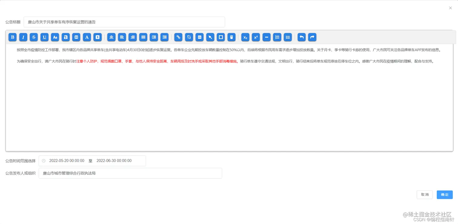 公告管理页面设计:除基本控件外,列表会显示公告标题、开始时间、结束时间、发布者或组织方、当期状态等关键信息。点击新增公告或者编辑公告会弹出全屏弹窗,管理员可以在输入框内使用富文本编辑器进行公告编辑(支持富文本样式调整操作)。下方可以选择公告时间范围和填写发布者或者组织,发布时间范围是指当前日期在指定时间内时,公告自动显示(图5-15与图5-16)。