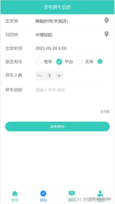 ⑷ 在发布拼车功能中,用户需要提供出发地、目的地、出发时间、需要几人参与拼车、是否有车、拼车说明等信息完成拼车发布。同时是否有车中提供三个选项(有车、无车、平台),其中选择平台将由司机端司机进行接单。