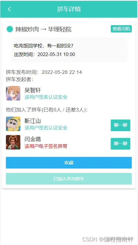 拼车详情页面设计:进入到拼车详情页会展示本次拼车相关信息,在本页中可以看到是由谁发起了拼车,并且点击聊天可以和拼车发起者进行在线聊天。同时在下方也会显示有哪些用户加入了本次拼车,在每位用户的名字下方会提示该用户是否具有电子签证,若未生成电子签证,则会进行风险提醒。点击聊天按钮也可以和同行用户进行在线聊天。在当前页面中可以进行收藏操作与申请加入拼车操作,若当前拼车已收藏,则收藏按钮将不可点击置为锁定状态并给出“已收藏”提示。当遇到一下情况时,申请加入按钮也会进入锁定状态:1.拼车发起人暂停了拼车、2.当前拼车已经满员、3.已经加入了本次拼车、4.该拼车是由自己发起的(图5-5)。
