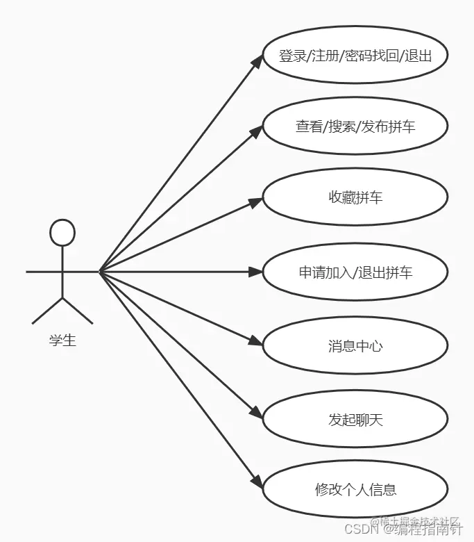 如图4-3所示,学生除了登录注册/密码找回/修改信息等基本功能外,还具有对拼车信息相关的基本操作权限(仅限于学生个人)。
