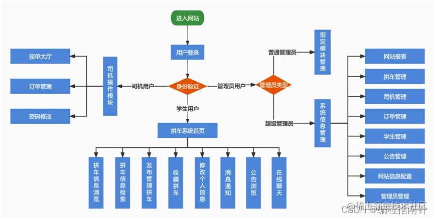 首先用户进入用户/司机/管理员登录页面进行登录,系统收到登录请求后会进行身份验证并进行相关页面跳转。若为司机用户,则进入到司机用户操作模块。若为学生用户则进入到拼车系统首页。当检测为管理账号时,则进行管理员类型判断,若为普通管理员可以进行指定权限模块管理,若为超级管理员则可以管理网站全部内容。