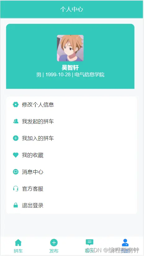 个人中心页面设计:个人中心页面主体部分为两个独立面板,第一个面板当用户登陆时会显示用的头像、姓名、生日、学院等关键信息,若用户完成修改信息或上传头像等操作之后,返回个人信息页面即可看到信息已同步更新(更换头像后拼车列表处的他们正在拼区域展示头像也会实时更新)。第二个面板为功能选项面板,包含功能有:修改个人信息、查看我发起的拼车、查看我加入的拼车、我的收藏、分享本站、退出登录六大功能选项(图5-9)。