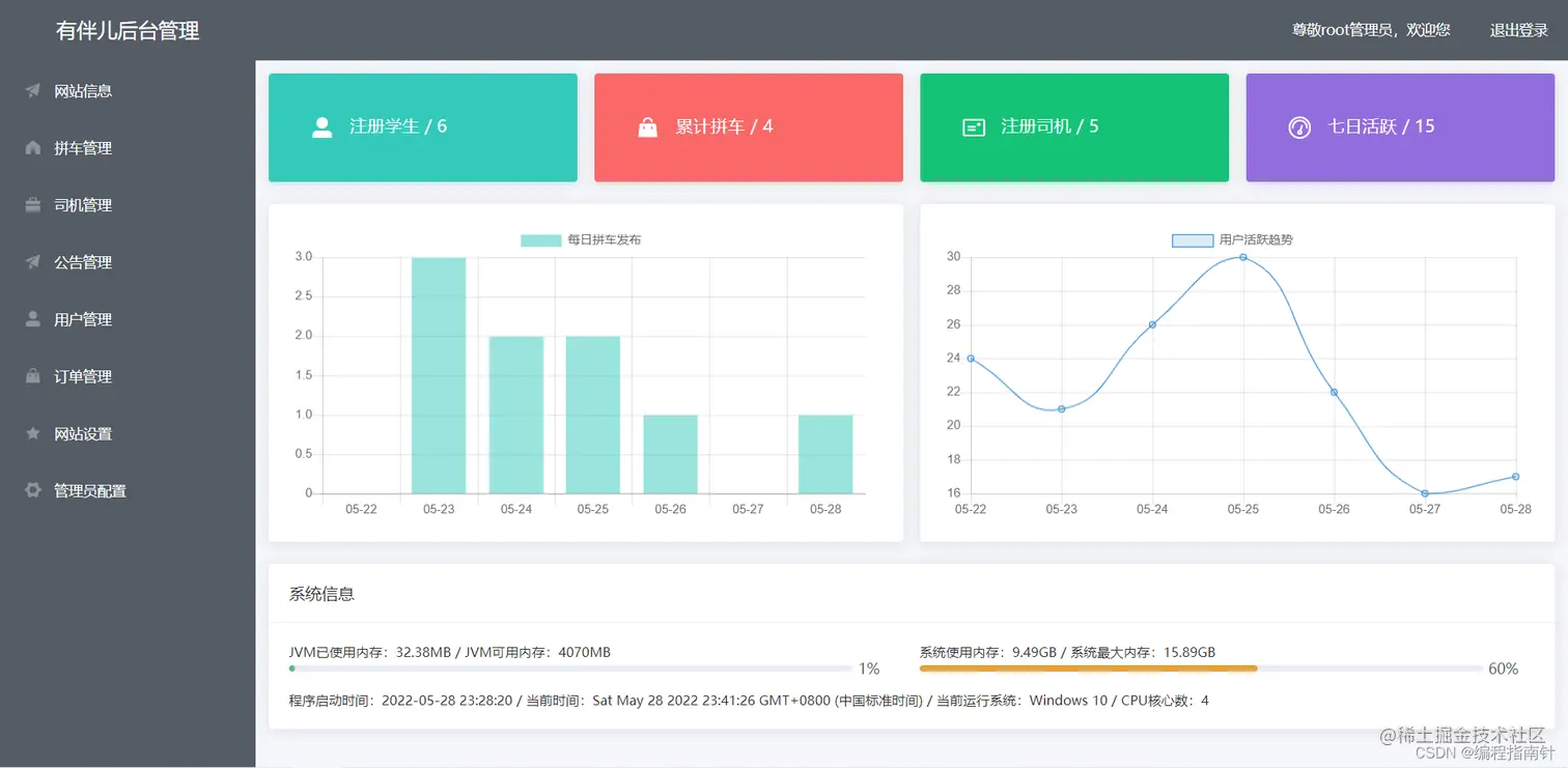 后台首页数据展示:本页面顶部四个部分为拼车发布数量统计、注册用户统计、注册司机统计、用户七日活跃度统计,其中七日活跃度是指七天内用户收藏、申请加入拼车、在线聊天等操作的活跃程度。在中间部分采用了Charts插件构建可视化报表,报表1展示了用户近七日发布拼车的数量统计(统计图),报表2展示了用户七日活跃的动态趋势(曲线图),两个报表可以帮助管理员很好的分析网站目前的使用状况,根据出行流量方便管理员作出相应调整。底部为Jvm占用内存与系统占用内存指示,若内存指示条为红色则说明用户较多应考虑升级硬件或限流访问。下方会显示程序运行开始时间与当前运行系统(图5-17)。