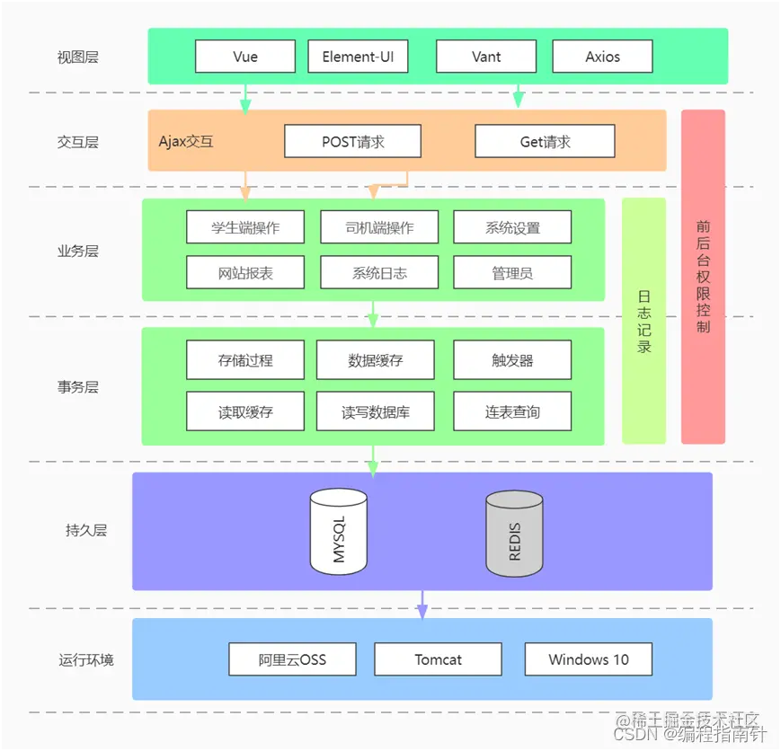 系统整体架构主要分为五层,分别为视图层、交互层、业务层、事务层、持久层,运行环境基于阿里云OSS、Tomcat、Windows 10操作系统。