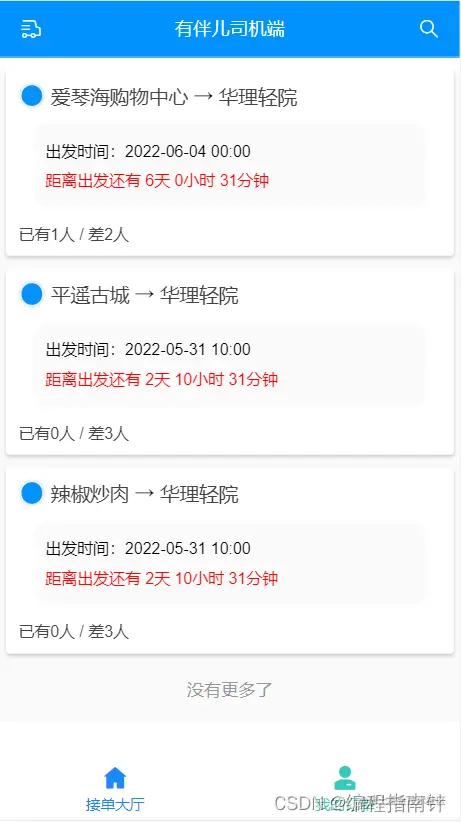 司机端设计与拼车页面大同小异,主颜色为蓝色,除基本对的登录注册修改密码之外,用户可以在接单大厅进行选择性接单。订单会提示距离出发还有多长时间,方便司机进行选择,司机确认订单后需要输入本次行程预估金额,点击确定后即可完接单。在我的订单页面中可查看已接订单,同时司机也可以取消该订单。