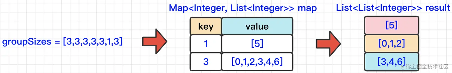 既然了解明白了题意,我们在思路一种,首先想到的是,要把原有的数组groupSizes中的每个元素,进行一个迁移操作。那迁移到哪里去会比较好呢?因为这里面涉及到userId与所在数组长度的对应关系,所以,我们第一个想到的就应该是迁移到Map结构中,Map中的key保存数组长度,value保存userId。那么以groupSizes=[3,3,3,3,3,1,3]为例,当迁移到map结构中以后,对应的key=1,value=[5];key=3,value=[0,1,2,3,4,6]。