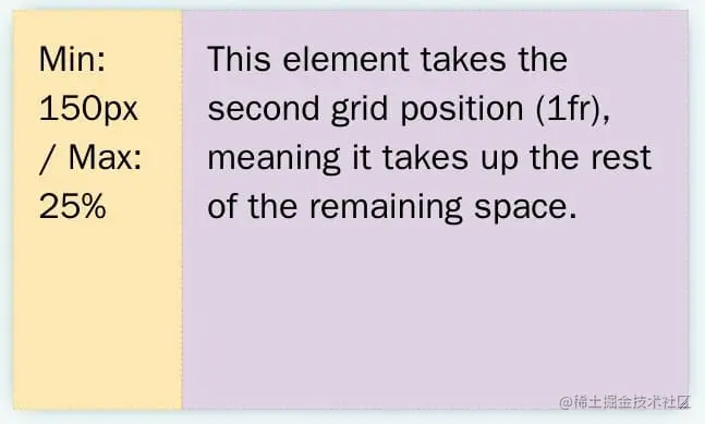 上面代码中,grid-template-columns指定页面分成两列。第一列的宽度是minmax(150px, 25%),即最小宽度为150px,最大宽度为总宽度的25%;第二列为1fr,即所有剩余宽度。