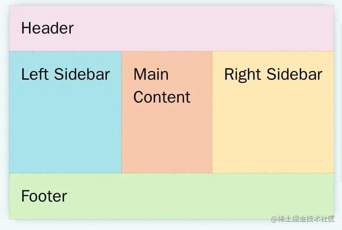 圣杯布局是最常用的布局,所以被比喻为圣杯。它将页面分成五个部分,除了页眉和页脚,内容区分成左边栏、主栏、右边栏。