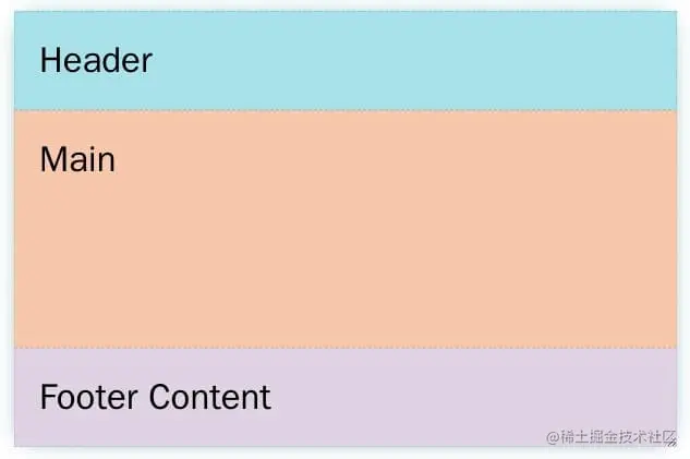 上面代码写在容器上面,指定采用 Grid 布局。核心代码是grid-template-rows那一行,指定垂直高度怎么划分,这里是从上到下分成三部分。第一部分(页眉)和第三部分(页脚)的高度都为auto,即本来的内容高度;第二部分(内容区)的高度为1fr,即剩余的所有高度,这可以保证页脚始终在容器的底部。