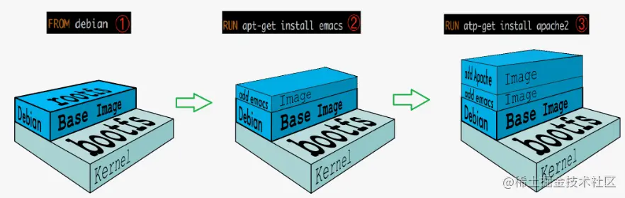 可以看到, 新镜像是从基础镜像 ( 此处是 Debin 镜像 ) 一层一层叠加生成的. 每安装一个软件, 就在现有镜像的基础上增加一层.