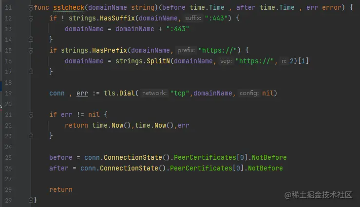 如上代码,我们增加了一个检测机制,分别是,如果是后缀没有加端口:443的话,添加一个:443(非:443端口,无法进行检测)。而后是若开头是https://,则去掉。返回的结果是证书申请时间,证书结束时间以及error。