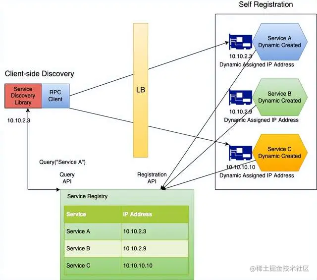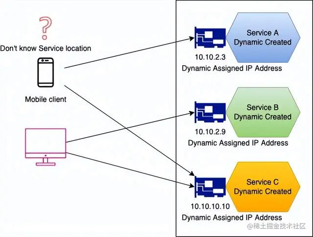 服务的IP地址不能在客户端静态配置。需要使用动态服务发现。从概念上讲,服务发现非常简单,它的主要组件是一个服务注册表,它包含一个应用程序服务实例的网络位置列表。