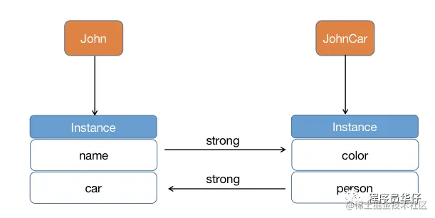 同样地,这种强引用关系就包含了循环引用。即john对象持有了johnCar,johnCar也持有了john。 如下图。