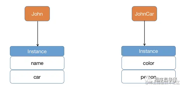 以上代码,在两个对象被创建和赋值后,就表现了强引用的关系。对象john现在有一个指向Car对象的强引用(johnCar),而变对象johnCar 有一个指向 Person 对象的强引用(car)。如下图。