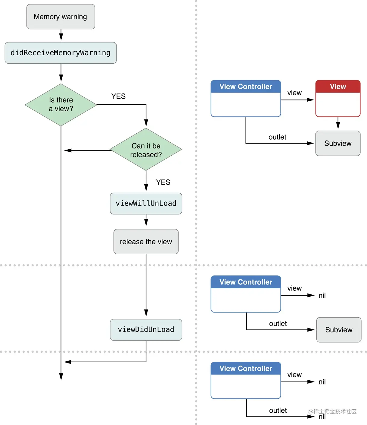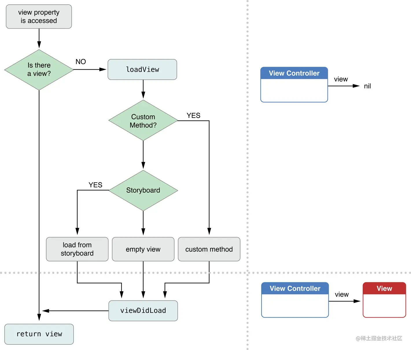 如果使用代码创建视图集,-viewDidLoad方法会在-loadView方法调用结束之后运行。