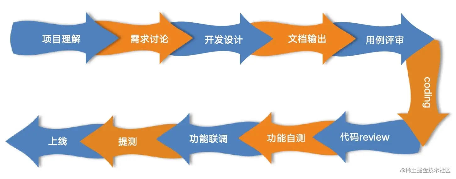 看一下这个项目开发流程图,当项目启动之后,产品的同事会先来一轮需求宣讲,告知大家本期大致做什么,产品的同事会整合各方的发言在完善一轮功能。