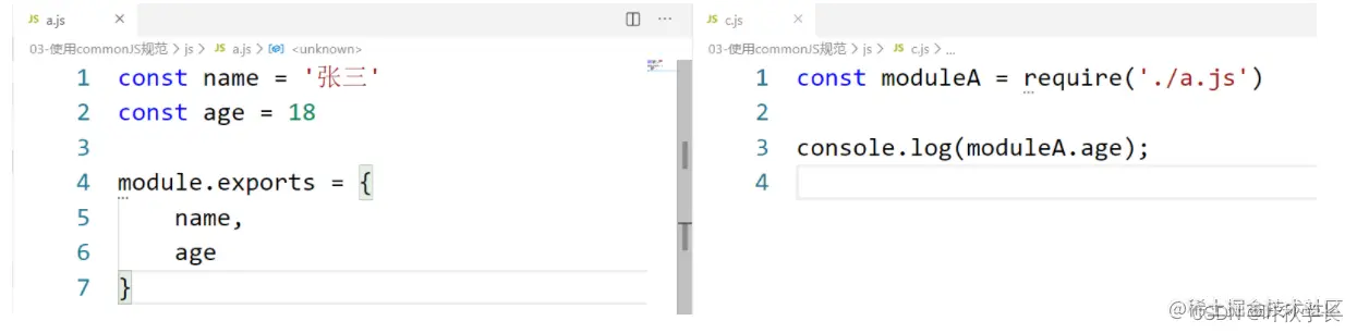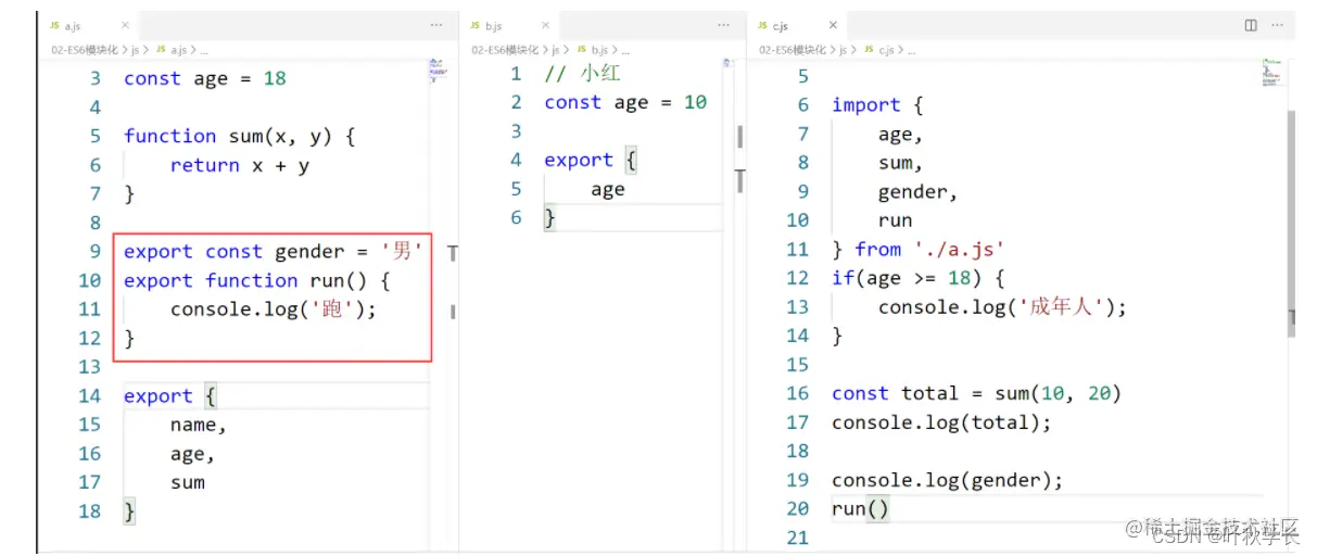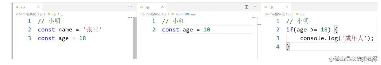 - 存在的问题:小明的a.js中的age >= 18 为true,c.js中的 age>=18为false,小明百思不得其解???