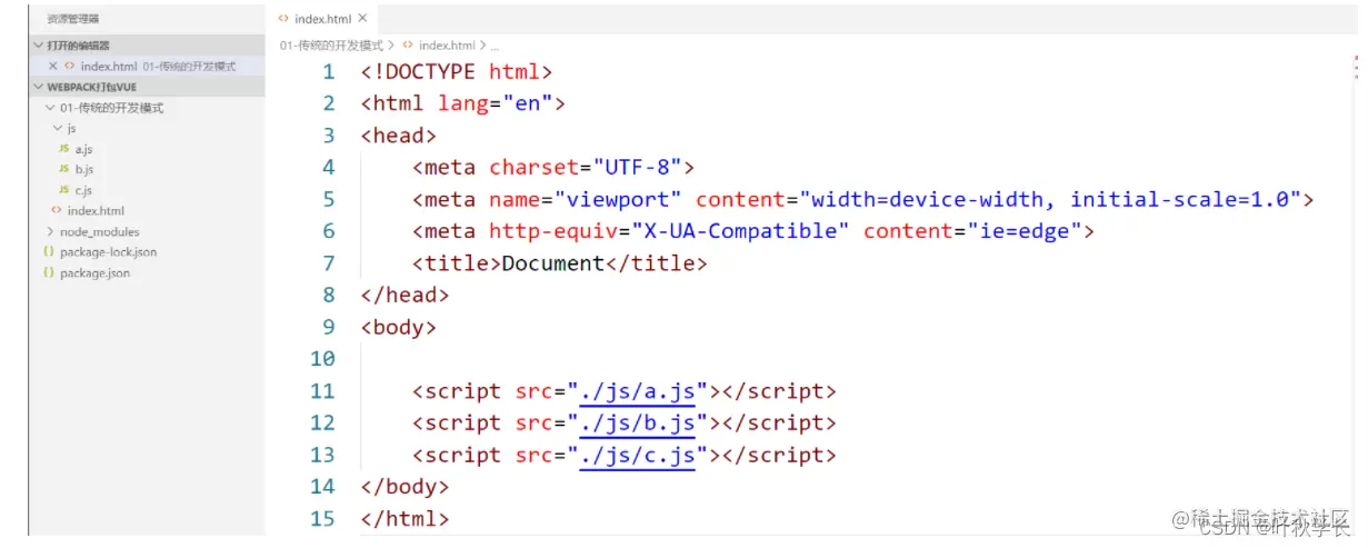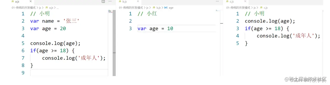 - 场景:有一个复杂的页面,需要小明和小红分别开发其中的部分模块。小明和小红分别写了各自的js文件,最后合并引入,小明的js文件为a.js和c.js;小红的文件为b.js。