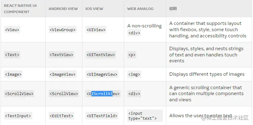 - 基础UI组件:如 View,Text,Image,TextInput,ScrollView 和 StyleSheet。此外,还提供了UI控件,如Button,Picker,Slider 和 Switch。