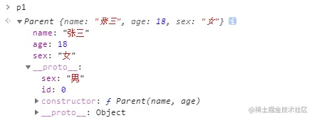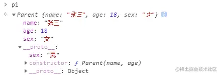 输出 p1,可以发现 p1 上有三个属性,它的原型 Parent 上只有 sex 一个属性,且这两个同名属性,在 p1 使用时,用的是 p1 自身的属性,而不是继承而来的。