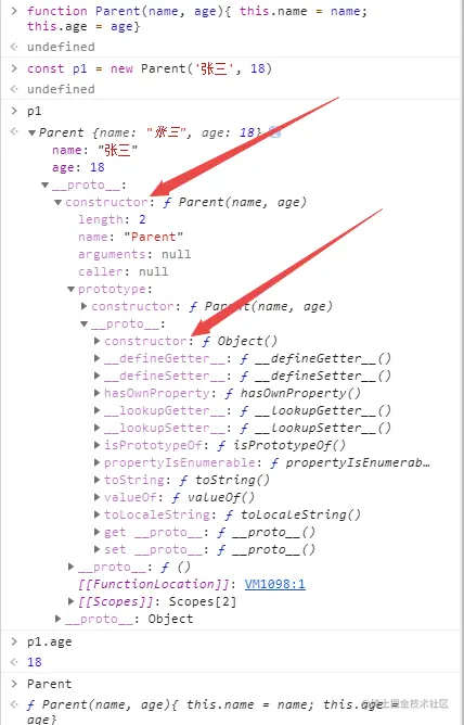 而 Parent() 函数的 proto 下的 construcor 属性则是指向了 Object。(每个原型的最终指向都是 Object。)