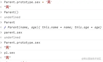 现在往 Parent 的原型上添加一个 sex 属性。可以发现,这个属性会被实例 p1 继承。其实可以说 prototype 存在的目的就是被实例继承。