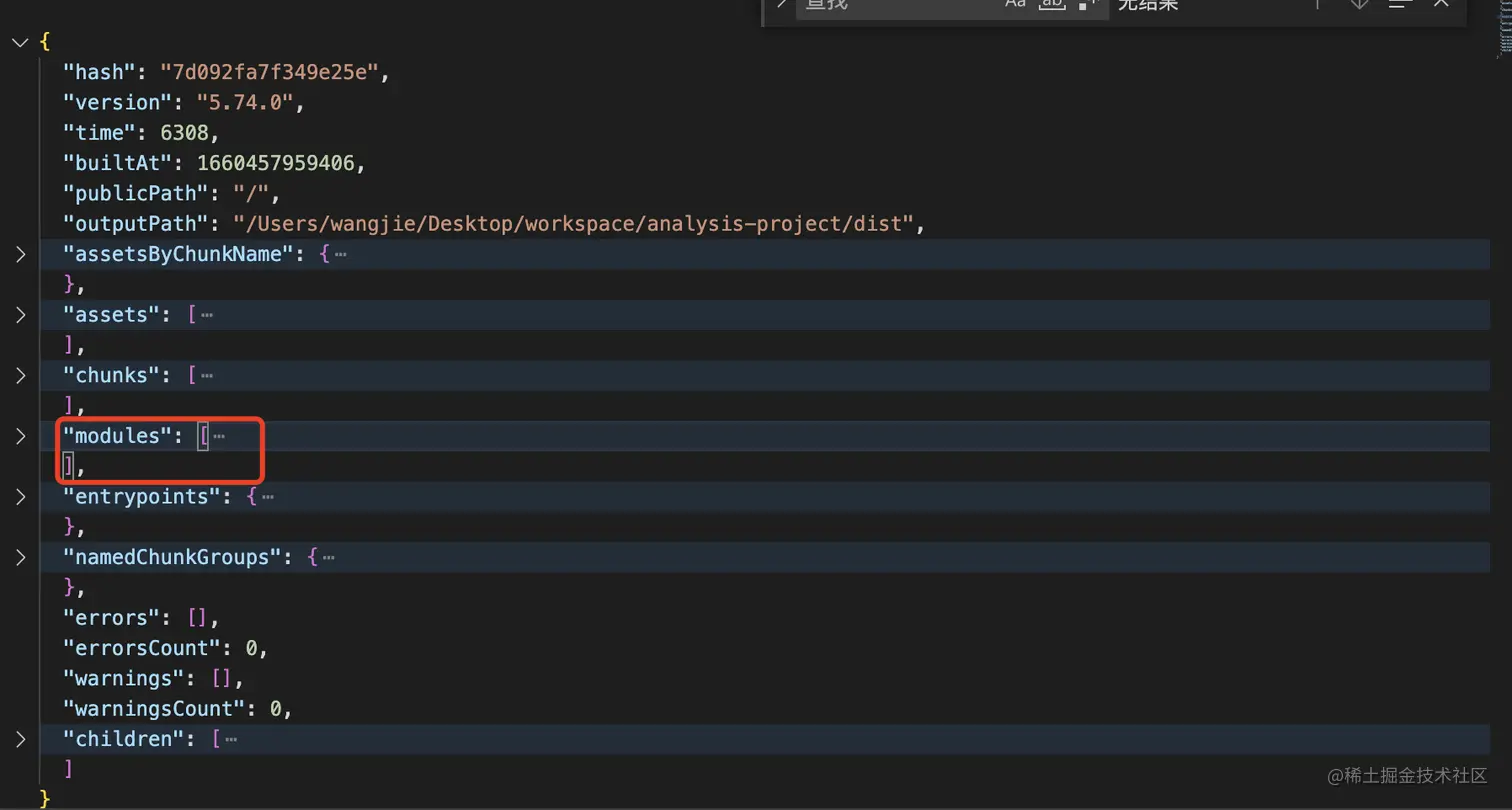 运行build命令, 打开dist/report.json, 我们要使用的mudules字段,这个模块记录到了构建过程中使用到的文件,记录的内容很丰富,我们找到自己需要的字段nameForCondition