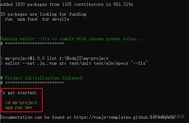 输入完命令后,会提示我们配置项目信息,可以一直回车使用默认配置,然后等待项目创建完成。