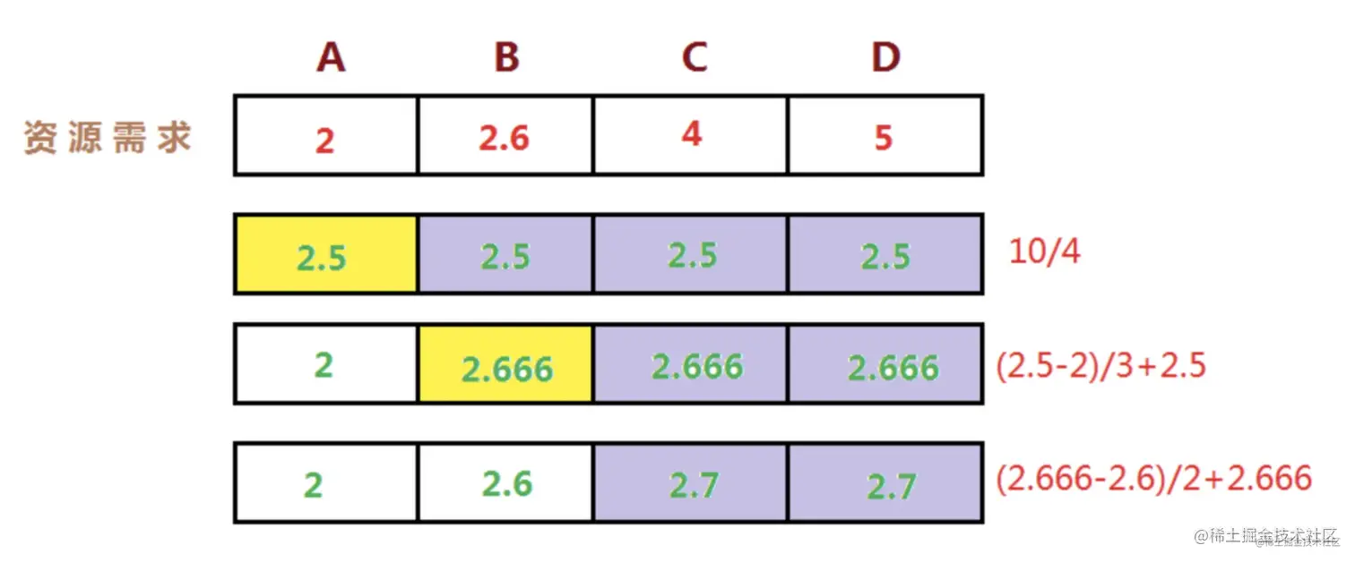 例如下面场景:A B C D 四个用户的资源需求分别是 2、2.6、4、5份,现在总共有 10 份资源,首先将所有资源均分,每个用户得到 2.5 份资源。对于 A 用户多分配 0.5 份,继续将这 0.5 份资源平均分配给 B C D,B 用户得到 2.666 份资源。会继续将 B 多分配的 0.066 份资源平均分配给 C 和 D。