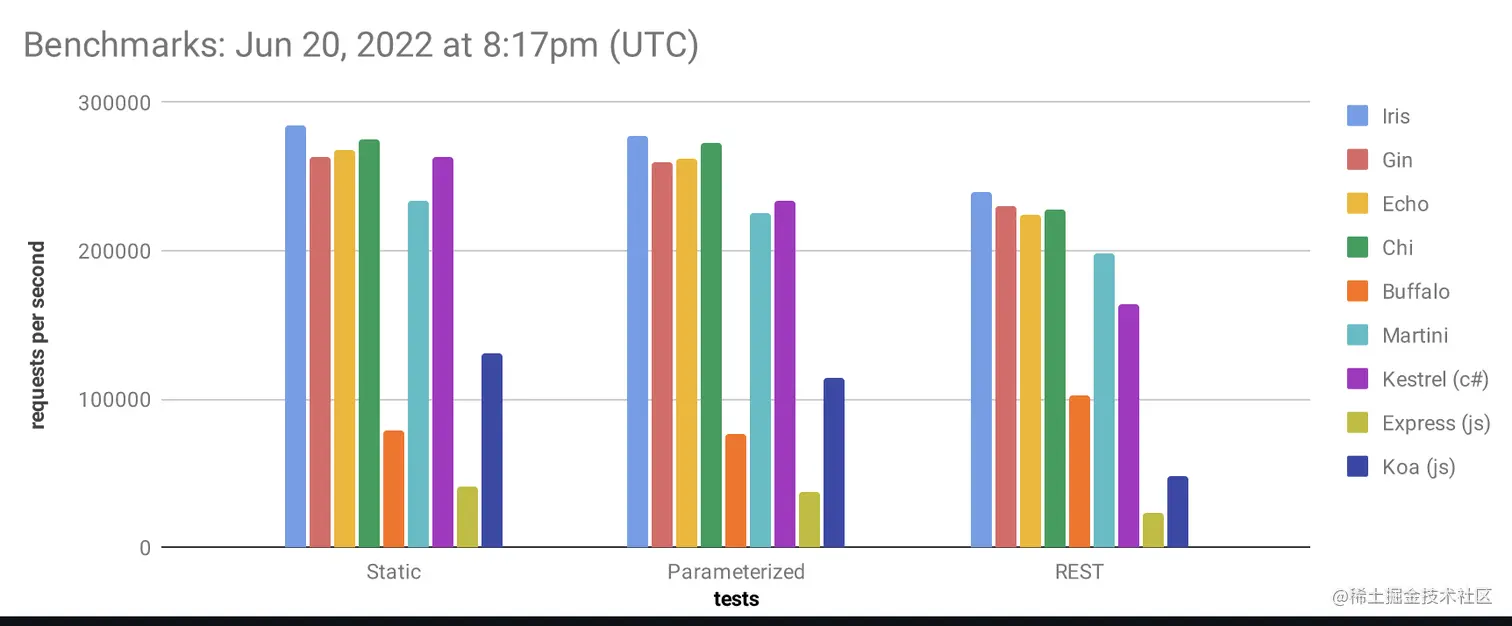 事实上,Iris本质上也是社区驱动的Go语言Web框架,支持http2/3,完备的MVC支持,奉行极简主义风格,轻量化与简明风格比起Gin来说,也不遑多让,与此同时,社区活跃度和文档支持都非常到位,但其拥有的极其恐怖的高性能特性,其他框架则是望尘莫及。在Iris身上,我们可以看到她对性能的近乎于偏执的完美追求,Iris为了优化性能,不惜自己开发和集成最快的组件,比如日志记录内置了golog模块,比如json序列化就选择了第三方库jsoniter,从框架设计的态度上,极尽完美之能事。