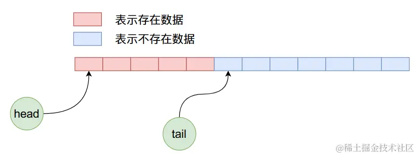 因为我们是使用数组存储队列当中的数据,从下表为0的位置开始,当我们往队列当中加入一些数据之后,队列的情况可能如下,其中head表示队头,tail表示队尾。