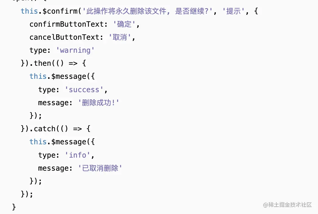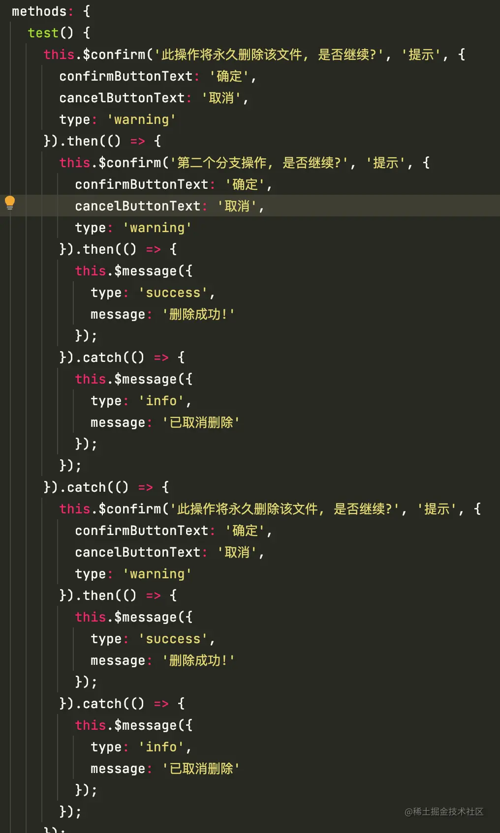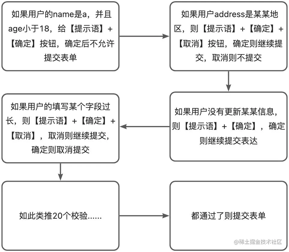 当用户点击【取消】就不予提交,点击【确定】就提交,这种相信大家也都用过很多次,我这次在做一个表单提交的时候这种校验实在是,太太太太多了,一共好像20几个吧(我的场景里面是一个线性的提示,就是没有要根据确定/取消再必须要去调另外的校验)按照提供最常规写法写一个:
