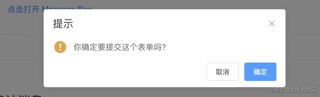 但是我们有时候要的不是表单里面某个表单项目的校验,例如现在我想要校验的是如果活动名称超过5个字并且活动区域小于2个字加上活动时间在当年的2月份里面的时候就提示用户,【你确定要提交这个表单吗?】这种联合条件的校验,这种我们往往就会使用到element里面的MessageBox这个组件来做提示,因为这个是需要用户去做选择的,就像下面这个
