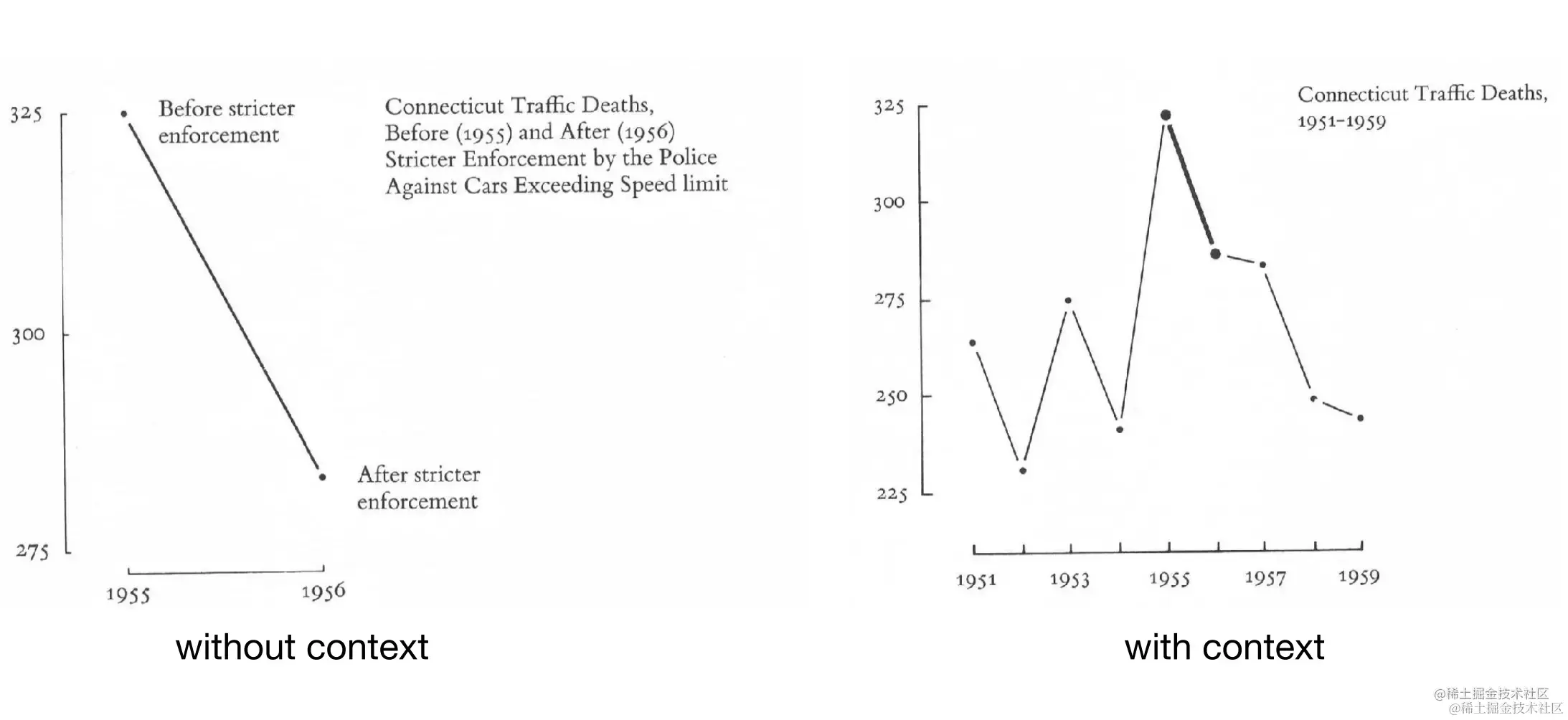 - 错误的数据洞察,产生于在图形的某个地方发生的不正确的视觉预期推断。 一个典型的例子:轴刻度,我们期望它从始至终都能够保持连贯且一致。