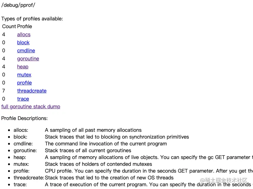/debug/pprof/goroutine?debug=1 当前goroutine的数目和大致信息