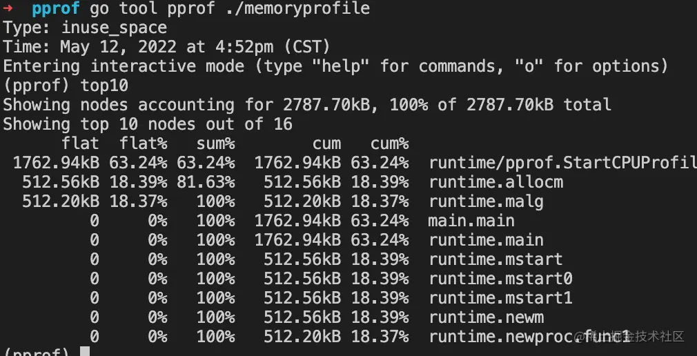 然后使用go tool pprof 文件名 命令可以进入交互式终端,使用命令查看占用情况(先用help命令看下有哪些命令)