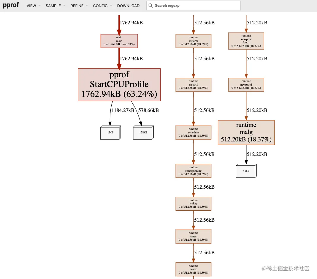 输入web可以以可视化的方式查看,也可以用go tool pprof -http localhost:3001文件名 命令可视化地查看(这种方式需要安装graphviz工具包)