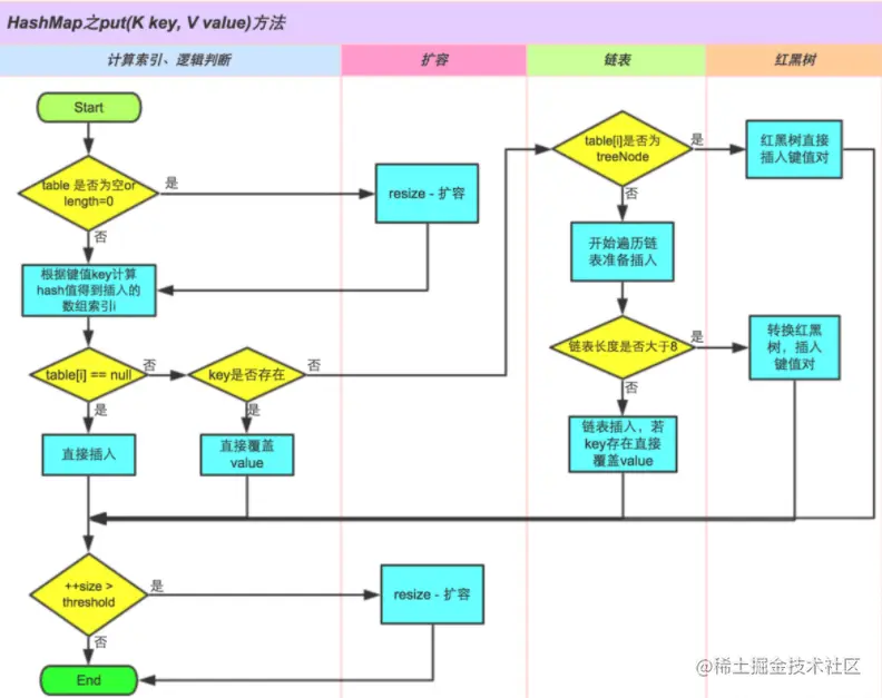 - 当添加 key-val 时,通过 key 的哈希值得到在table的索引,然后判断该索引处是否有元素,如果没有元素则直接添加,如果有元素则继续判断该元素的 key 和准备加入的 key 是否相等,如果相等,则直接替换 val;如果不相等则需要判断是树结构还是链表结构,做出相应处理,如果添加时发现容量不够,则需要扩容。