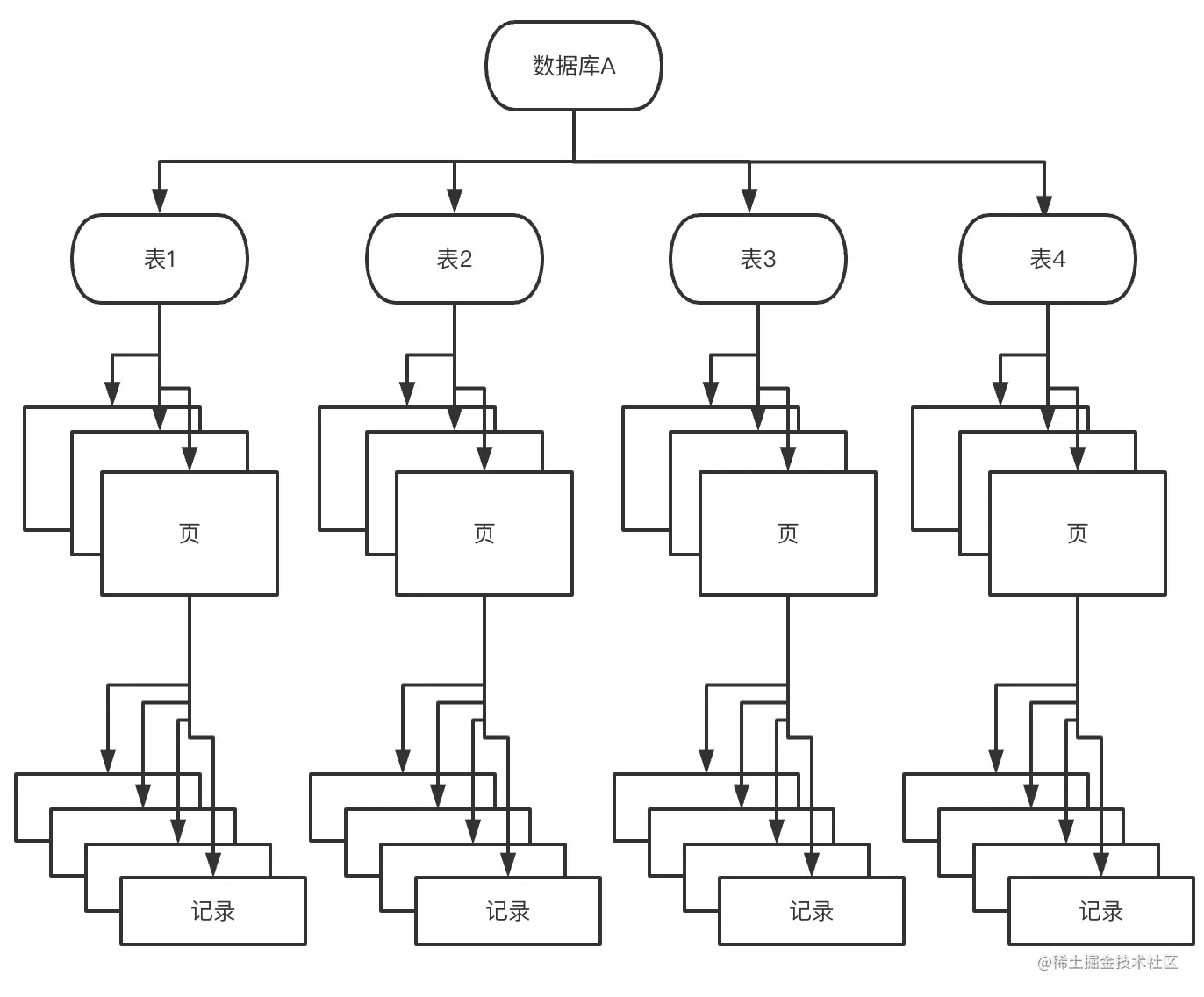 把上锁对象看成树,如果要对页上的记录r进行上X锁,那么分别需要对数据库A、表、页上意向锁IX,最后记录r上X锁,如果其中任何一个部分导致等待,那么该操作需要等待粗粒度锁的完成。比如说对r记录加x锁之前,已经有一个事务对表1进行了S表锁,那么之后的事务要对记录r在表1上加上IX,必须要等待表锁操作完成