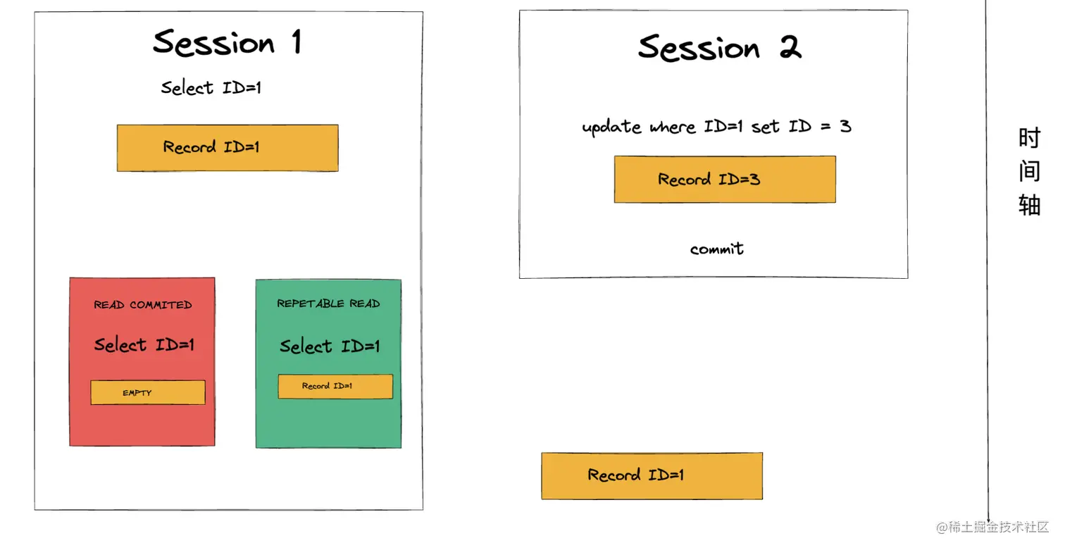 但是目前的数据库隔离级别都不会导致这样的情况发生,因为对数据进行更新需要加锁,所以上述的例子中事务2的操作会被阻塞