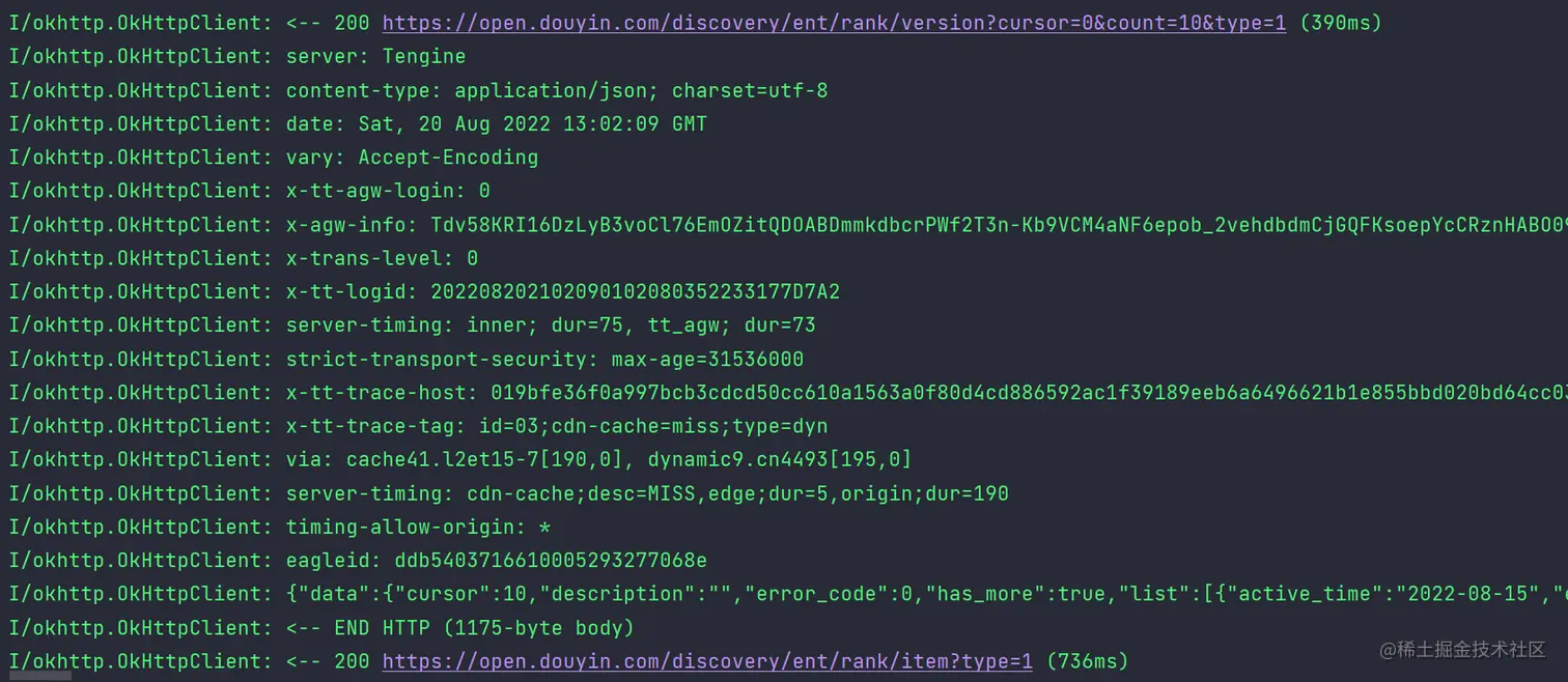 我们在项目中为创建的OkHttp单例添加了日志打印拦截器HttpLoggingInterceptor,当项目以DEBUG模式运行时打印请求体Body的内容,以便我们在调试网络请求部分相关代码时可以清晰地查看发送的请求体内容和接收到的响应内容。如下图所示为请求榜单版本数据时打印的调试日志: