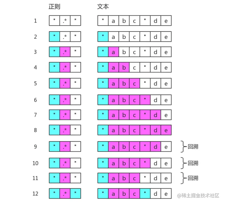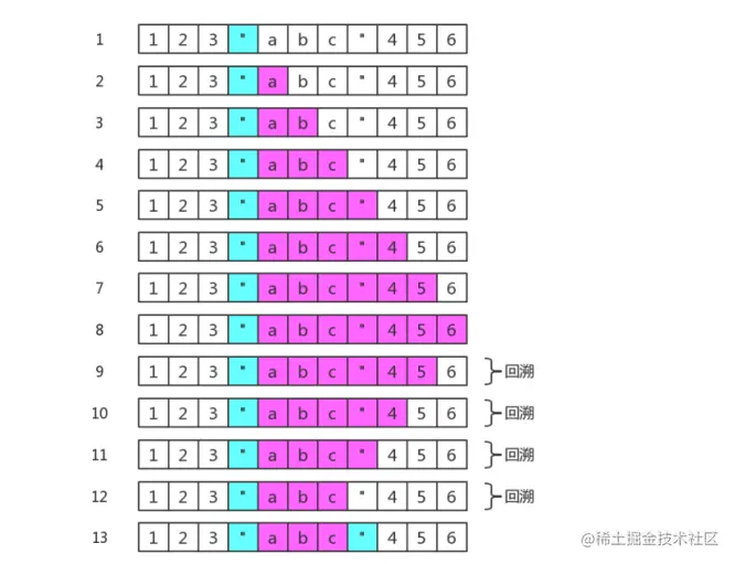 使用 /".*"/ ,会出现四次回溯。