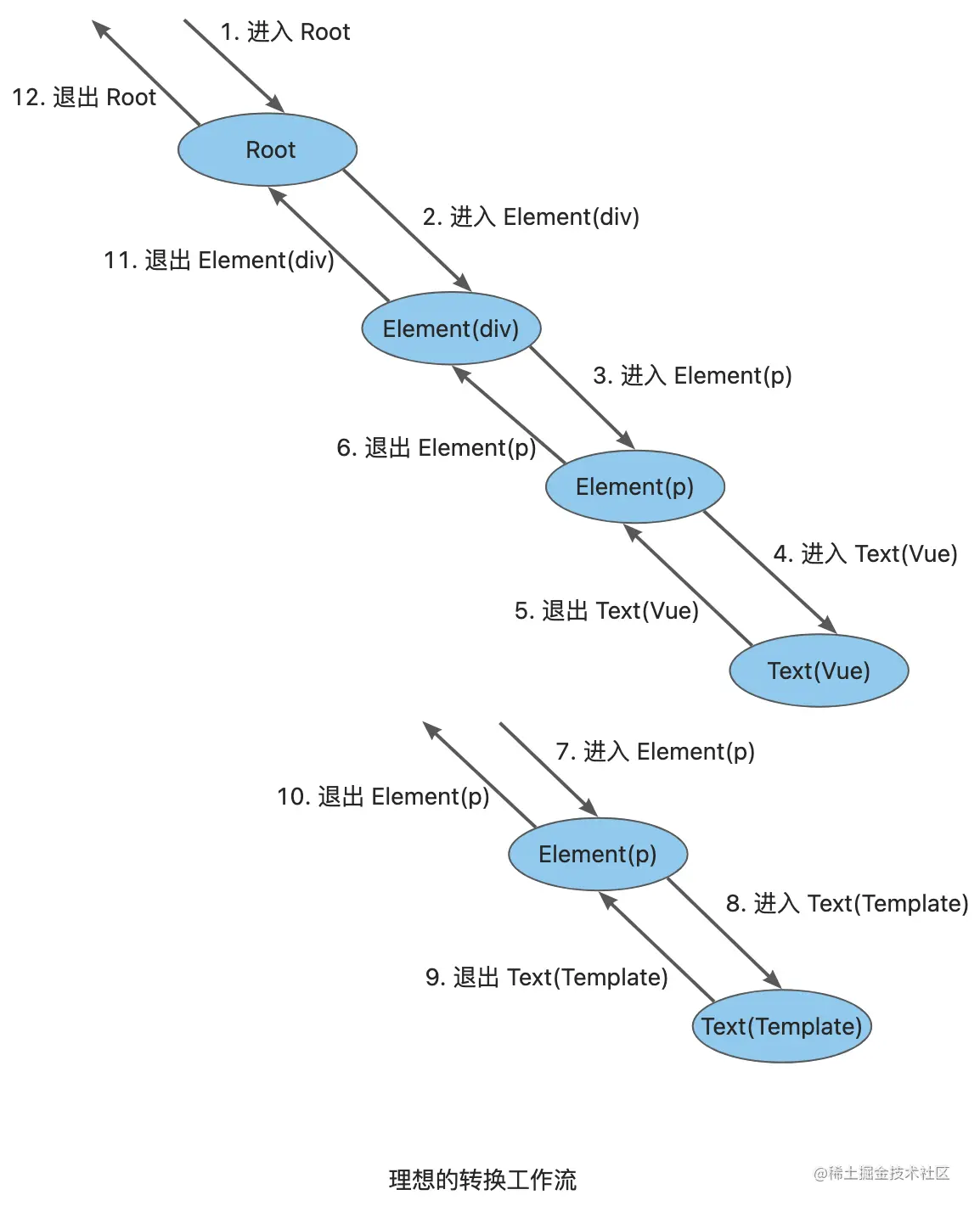 可以看到,transformText 函数同样也是把转换文本节点的逻辑放在了一个回调函数中,这样就能保证其当前转换节点的所有子节点都是被处理完毕的。