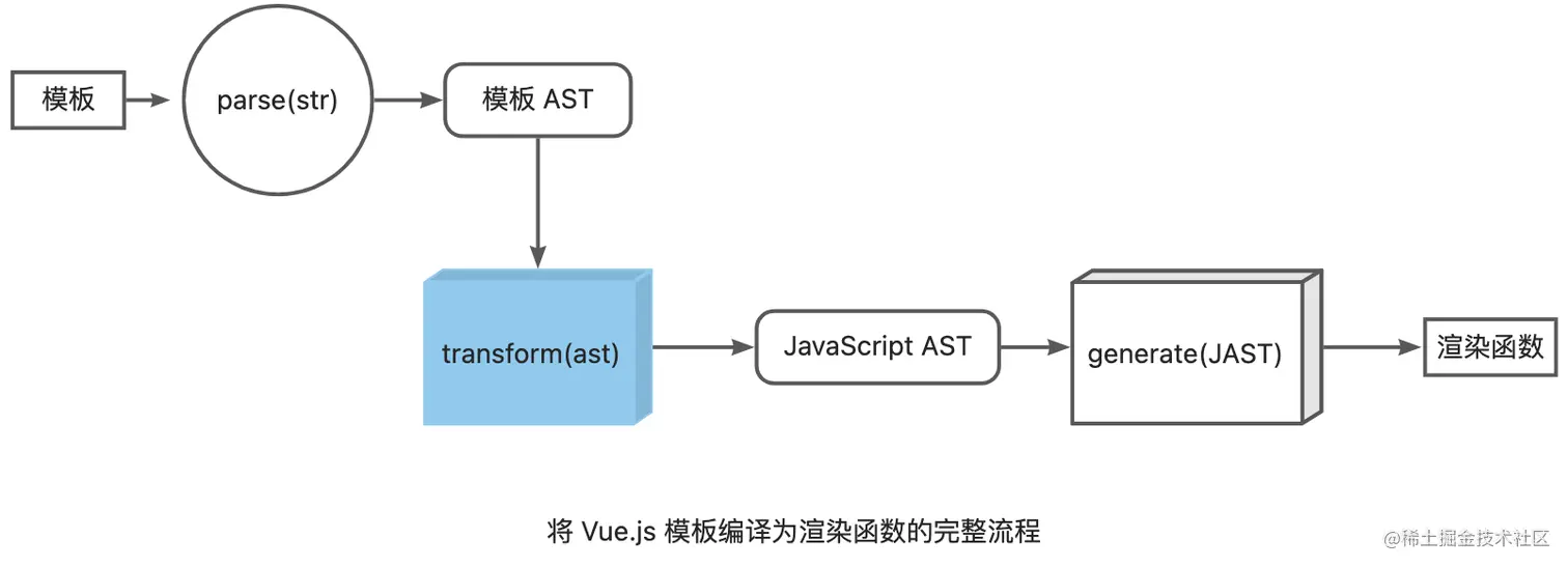 JavaScript AST 转换器 transform 在编译器的编译过程中负责将 模板AST 转换为 JavaScript AST,如下图所示: