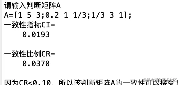 disp('因为CR<0.10,所以该判断矩阵A的一致性可以接受!');