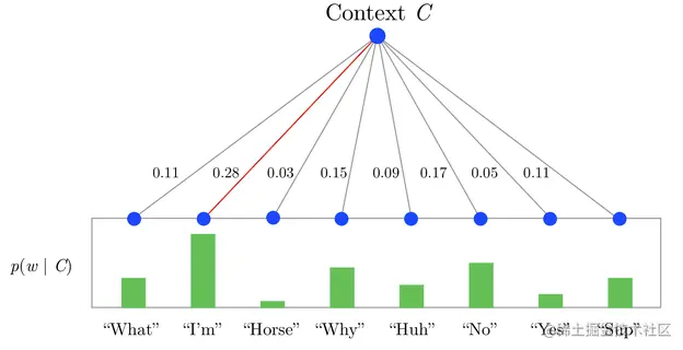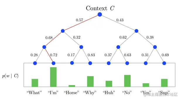 每一个node都有自己的embedding , 既单词w路径上第j个node的embedding,输入输出的单词内积,变为输入单词和node的内积, 每个单词的概率计算如下