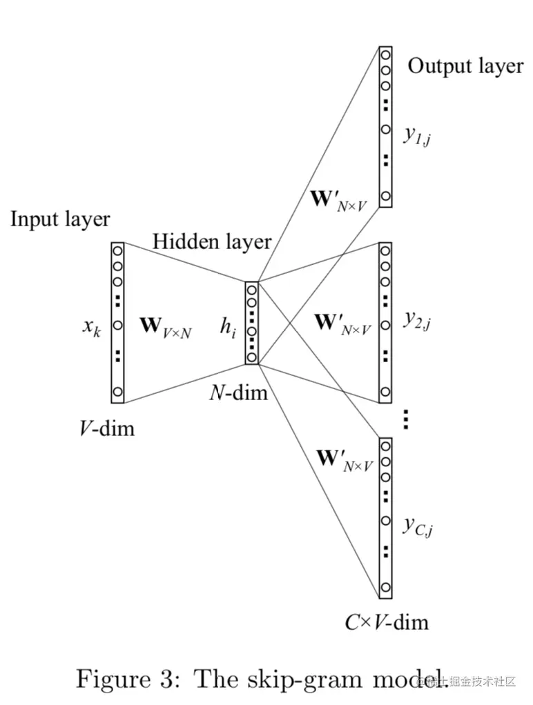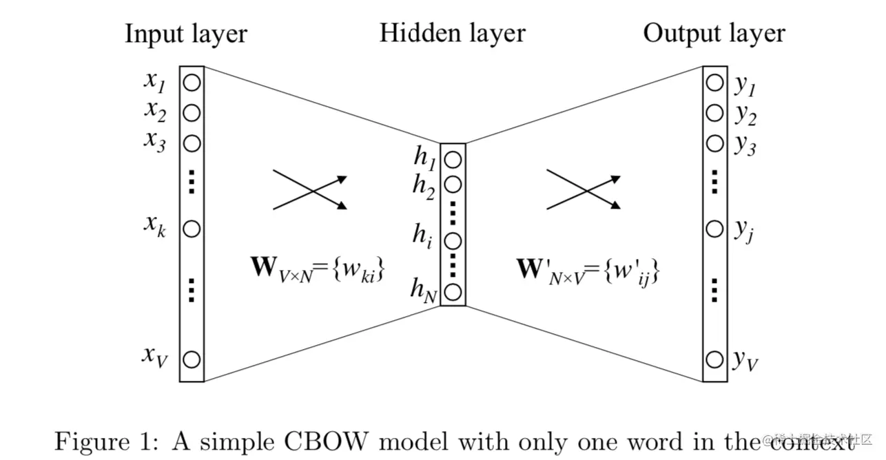 让我们先把问题简化成1v1的bigram问题,单词i作为context,单词j是target。V是单词总数,N是词向量长度,D是训练词对,输入是one-hot向量。