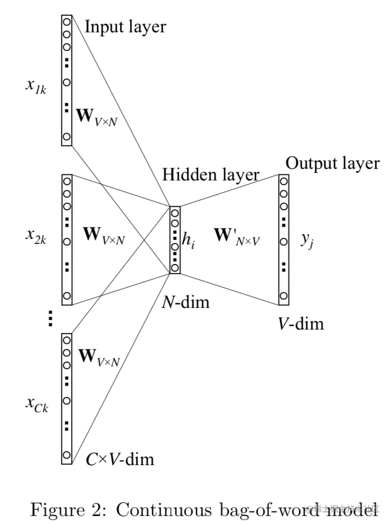 对比bigram, CBOW只多做了一步操作,对输入的2 * Window_size个单词,在映射得到词向量后,需要做average_pooling得到1*N的输入向量, 所以差异只在h的计算。假定C = 2 * window_size