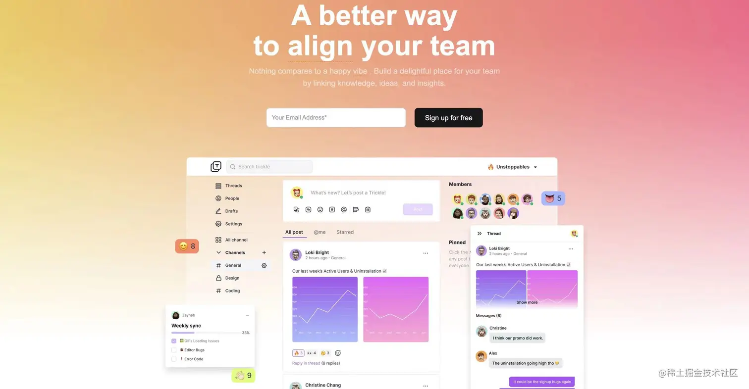- Trickle - 这是一个论坛形式的产品, 定位是给公司团队成员使用。用于工作交流,每个人都可以发表自己的想法。这个产品看上去是介于 Wiki 和 IM 聊天工具中间的一个产品。这个产品的是想把团队成员的知识、想法和见解联系起来,来让团队成员的想法能够得到共享和互动。看上去是面向小型公司团队。特别要说的是这个产品的交互体验做的非常好!不管是视觉 UI 还是微动效,细节做的很到位。目前看这个产品还没有做商业化变现的计划,可能后期会以订阅的形式付费使用。