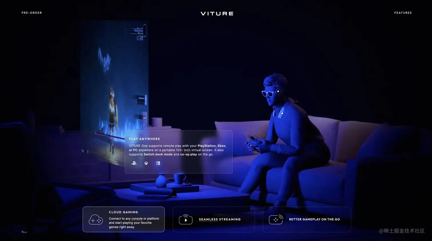 - viture - 这是一个XR眼镜的官网,正在 kickstarter 上众筹,让您可以随时随地通过5G/Wifi连接玩 3A 游戏或看电影。网站做的非常炫酷!